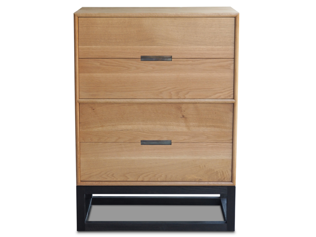This 4 drawer chest on stand makes a sophisticated statement in any modern bedroom. Discreet hand pull hardware accentuates the stunning solid white oak drawer fronts.
